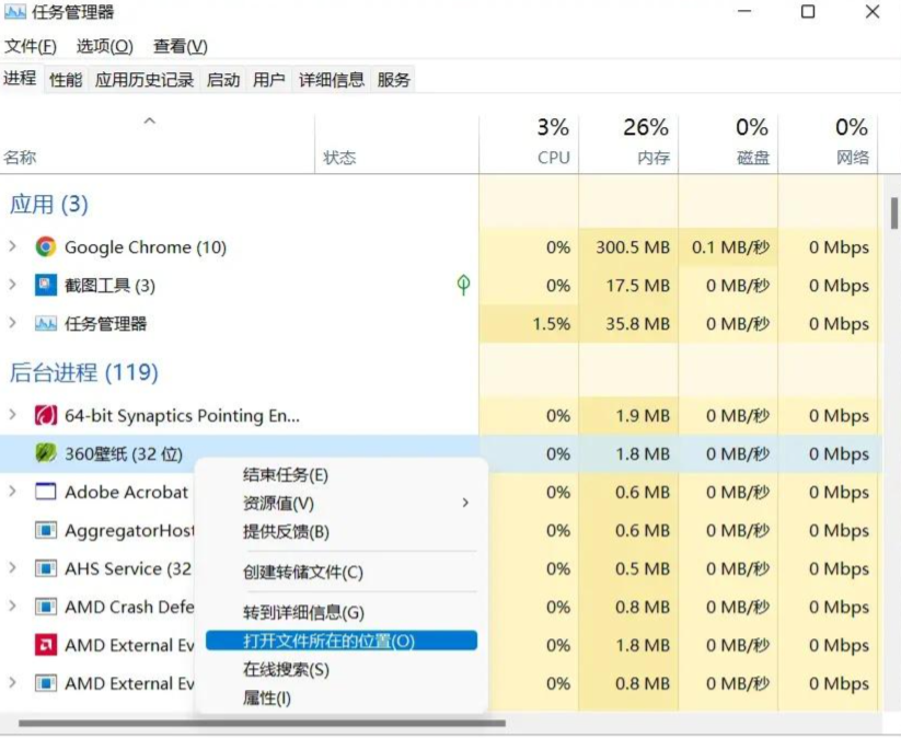 2、在“任务管理器”——“进程”——“360壁纸”,点击鼠标右键,选择“打开文件所在的位置”;